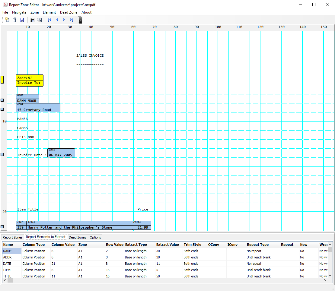 Developers import an example of an existing report and visually map the content using a rules based mvPDF Zone Editor that lets mvPDF identify the report content and how the elements relate to one another: dead zones, report sections, headings, repeating lines, totals, page repeats, wrapped text.